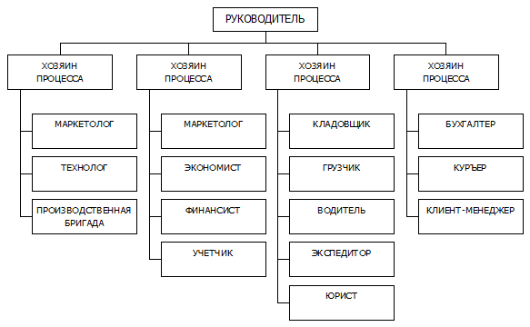 Рис.44. Линейно-функциональная структура управления Недостатки линейной структуры: - в работе руководителей практически всех уровней оперативные проблемы («текучка») доминируют над стратегическими; - слабые горизонтальные связи между функциональными подразделениями порождают волокиту и перекладывание ответственности при решении проблем, требующих участия нескольких подразделений; - малая гибкость и приспособляемость к изменению ситуации; - критерии эффективности и качества работы подразделений и организации в целом разные и часто взаимоисключающие; - большое число «этажей» или уровней управления между работниками, выпускающими продукцию, и лицом, принимающим решение; - перегрузка управленцев верхнего уровня; - повышенная зависимость результатов работы организации от квалификации, личных и деловых качеств высших управленцев. Таким образом, можно заключить, что в современных условиях недостатки структуры перевешивают ее достоинства. Процессная модель Истоки концепции управления процессами ведут к теориям управления, разработанным еще в XIX веке. В 80-х годах XIX-го века Фредерик Тейлор предложил менеджерам использовать методы процессного управления для наилучшей организации деятельности. В начале 1900-х годов Анри Файоль разработал концепцию реинжиниринга – осуществление деятельности в соответствии с поставленными задачами путем получения оптимального преимущества из всех доступных ресурсов (Рис.45). Процессные системы строятся на базе нескольких базовых принципов: - принцип объединения процедур: выполнявшиеся различными сотрудниками операции, интегрируются в одну, то есть происходит горизонтальное сжатие процесса. Если не удается привести все шаги процесса к одной работе, то создается команда, отвечающая за данный процесс; - принцип неразрывной последовательности: шаги процесса выполняются в естественном порядке, работа выполняется в том месте, где это целесообразно, смешанными группами, состоящими из работников различной предметной (функциональной) принадлежности или специализации; - принцип владельца процесса: уполномоченный менеджер обеспечивает единую точку контакта, он играет роль буфера между сложным процессом и заказчиком, и ведет себя с заказчиком так, как если бы был ответственным за весь процесс; - принцип самостоятельности выбора: исполнители принимают самостоятельные решения и несут ответственность за получение заданного результата деятельности; - принцип горизонтального контроля: качество результата проверяется его потребителем – следующим элементом процессной цепочки; - принцип системности (целостности) управления: управление затратами происходит по месту их возникновения, система управления издержками строится совместно с организационной структурой, без отрыва от деятельности, «один процесс – одно подразделение – один бюджет».