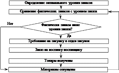 Рисунок 14 – Процедура контроля материалов Уровень запаса материалов зависит от сроков их поступления и расхода. Ответственность за обеспечение оптимального запаса по каждому наименованию находящихся на хранении материалов несет заведующий складом (кладовщик). Он ведет оперативный учет количества наличных материалов в карточке складского учета (форма М-15). При обработке на компьютерах вместо карточек складского учета достаточно просматривать на дисплее информацию об остатках материалов и точке заказа. Несоответствие между спросом производства и предложением склада устраняется путем подачи заявки в отдел снабжения на определенное количество материала в размере повторного заказа. Если действует компьютеризированная система, то компьютер автоматически печатает заявку, когда уровень запаса достигает точки заказа (уровня запаса, при котором наступает необходимость его пополнения). Практика показывает, что на складах могут быть допущены ошибки, влияющие на размер и точку заказа. Для выявления неточных записей и других ошибок имеется система учета, объединяющая функции контроля запасов и контроля производства.