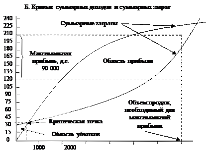 Левее критической точки (1000 ед.) предприятие будет нести убытки, так как суммарные затраты превышают суммарные доходы. Справа от критической точки – область прибыли, где суммарные доходы больше суммарных затрат. Проблема заключается в нахождении точки (уровня производства), в которой прибыль максимизируется, и в определении роли ценообразования в этом анализе.