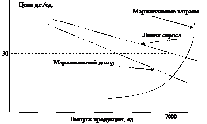 Прибыль достигнет максимальной величины в точке, где разница между суммарным доходом и суммарными затратами наибольшая. На графике Б эта точка соответствует 7000 ед. проданной продукции. При этом уровне продаж суммарный доход составляет 210 000 д.е., суммарные затраты равны 120 000 д.е., а прибыль – 90 000 д.е.. Теоретически, если одна дополнительная единица продукции будет продана, прибыль на единицу будет уменьшаться, поскольку суммарные затраты растут быстрее, чем суммарные доходы. Можно видеть, что если предприятие продает 11 000 ед. продукции, то практически вся прибыль будет «съедена» возросшими затратами. Таким образом, объем продаж 7000 ед. продукта – оптимальный операционный уровень, и цена, соответствующая этому уровню, наиболее приемлемая (оптимальная). Чтобы охарактеризовать оптимальную цену товара или услуги, используется понятие маржинального дохода и маржинальных затрат. Маржинальный доход представляет собой изменение в суммарных доходах, вызванное изменением выпуска продукции, на 1 единицу. Маржинальные затраты показывают, на сколько изменились суммарные затраты на 1 единицу в связи с изменением выпуска продукции. На графике В (рис.34) для нашего примера представлены линии, отражающие маржинальный доход и маржинальные затраты на каждую проданную единицу продукции. Обе линии пересекаются в точке 7000 ед. После этой точки с увеличением количества произведенной продукции прибыль уменьшается. Маржинальные затраты превысят маржинальные доходы для каждой проданной единицы сверх 7000 ед. В точке пересечения будет достигнута максимальная прибыль. Проецируя эту точку на кривую производственного спроса, можно определить оптимальную цену, которая в нашем случае составляет 30 д.е. за единицу продукции. Однако информация, полученная посредством методов микроэкономики, не должна быть единственной для принятия окончательного решения.