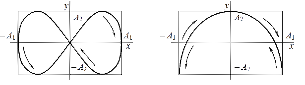 Траектория представляет собой эллипс c направлением обхода по часовой стрелке. При А 1 = А 2 = А траектория превращается в окружность радиуса А.