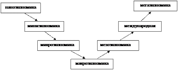 Сегодня термин «экономика» используется в трех значениях. Так называют: 1. все народное хозяйство страны или его часть, включая отрасли и отдельные виды материального производства и непроизводственной сферы (промышленность, сельское хозяйство, транспорт, строительство, жилищно-коммунальное хозяйство и т.д.); 2. совокупность отношений людей в процессе производства, распределения, обмена и потребления материальных и нематериальных благ и услуг, необходимых для удовлетворения многообразных потребностей, соответствующих данному уровню развития производительных сил; 3. научную дисциплину, которая изучает систему хозяйственной деятельности людей, принципов и законов ее организации (экономическая теория), а также ее отдельных составных элементов (например, экономика труда, экономика управления, экономика отраслей). В этом смысле экономика есть выражение в системе категорий, понятий и законов взаимосвязей и процессов объективного мира. В центре внимания – проблема использования людьми ограниченных ресурсов для производства товаров и услуг в целях удовлетворения своих потребностей. Большинство современных экономистов признают экономическую теорию универсальной наукой о проблемах выбора ресурсов и экономическом поведении человека, поэтому наиболее общим (собирательным) и правильным можно Попытки развития экономической теории в вертикальном разрезе привели к массе гипотез «расчленения» экономической теории. Все ее части значительно различаются по степени изученности и разработанности. На сегодняшний день можно выстроить следующею иерархию: нано-, мини-, микро-, макро-, мезо-, международная, мегаэкономика (рис. 1).