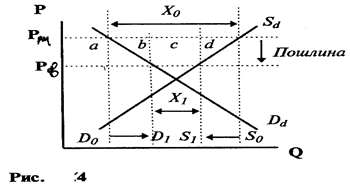 Тариф на импорт обеспечивает защиту отечественных производителей аналогичных товаров, а отечественные потребители оказываются в числе проигравших, так как облагаются дополнительным налогом через возросшие цены. В условиях свободной торговли внутренние цены товаров (Рb) будут близки к мировым ценам (Рm) и избыток спроса над предложением покрывается за счет импорта (рис.,1). В результате введения тарифа импорт сокращается до величины Отечественное производство расширяется потому, что отечественные производители не платят тариф, и поэтому могут производить свои товары с более высокими предельными издержками, чем на мировом рынке. Тариф на импорт, таким образом, защищает низкоэффективные отрасли отечественного производства от иностранной конкуренции. При этом отечественные потребители в целом сокращают свои закупки из-за повышения цен как на отечественные, так и на импортные товары. Чистые потери потребителей от введения тарифа образуют область (“a + b + с + d”), которая характеризует сокращение величины потребительского излишка. Часть возросших платежей потребителей поступает теперь отечественным производителям в виде возросших прибылей от продаж (площадь “a”). Отечественные фирмы в импортозамещающих отраслях реализуют теперь свой первоначальный объем выпуска Выигрыш производителей от введения тарифа на импорт не перекрывает потерь отечественных потребителей. Последние оказываются тем более существенными, чем сильнее общий импульс к повышению уровня цен и уровня инфляции, задаваемый введением торговых ограничений. Площадь “с” поступает в государственный бюджет и выступает поэтому в виде выигрыша государства, который равен величине импорта, умноженной на величину тарифа. Эти доходы являются трансфертом от потребителей в пользу государства, которое может использовать эти средства в соответствии с целями бюджетно-налоговой политики: на развертывание дополнительных социальных программ, на снижение подоходного налога, увеличение заработной платы государственным служащим и так далее. Часть этих средств может быть, таким образом, возвращена потребителям, но часть их может оказаться безвозвратно, потерянной в виде издержек, связанных с бюрократической деятельностью администрации и “протаскиванием” в парламенте тарифов, защищающих интересы отдельных групп, что особенно характерно для переходных экономик. Чистые потери национального благосостояния представлены областями “b” “d”. Область “b” представляет производственный эффект – сокращение благосостояния вследствие переключения потребительского спроса с более дешевой импортной продукции на более дорогую отечественную. Возросшие платежи потребителей стимулируют расширение не эффективного отечественного производства с высокими предельными издержками, в то время как при отсутствии тарифной защиты ресурсы труда и капитала могли бы быть использованы более эффективно в других секторах экономики. Область «d» представляет потребительский эффект тарифа - сокращение благосостояния вследствие вынужденного снижения потребления. Потребители согласны были бы заплатить за дополнительное количество товара цену в интервале от Рm до Рb для того, чтобы удовлетворить свой спрос, не сокращая его. Однако тариф не позволяет этого сделать, и поэтому внутренне