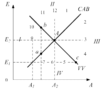 Кривая VV показывает все имеющиеся сочетания валютного курса Е и внутренней абсорбции А, при которых обеспечивается внутренний баланс. Она имеет отрицательный наклон, поскольку в результате девальвации улучшается торговый баланс, что означает рост экспорта и уменьшение импорта и, следовательно, сокращение внутренней абсорбции. Если при девальвации произойдет меньшее, чем нужно для равновесия, сокращение абсорбции, спрос превысит предложение и возникнет инфляция, если больше, напротив, предложение превысит спрос и возникнет безработица. Кривая САВ показывает все имеющиеся сочетания валютного курса Е и внутренней абсорбции А, при которых обеспечивается торговый баланс. Она имеет положительный наклон, поскольку в результате девальвации улучшается торговый баланс, что должно быть перекрыто соответствующим ростом абсорбции, приводящей к увеличению импорта настолько, чтобы торговый баланс остался в равновесии. Если при девальвации произойдет больший, чем нужно для равновесия, рост абсорбции, возникнет дефицит торгового баланса, если меньший – его положительное сальдо. Внешний баланс в данном случае упрощенно представлен только торговым балансом. Девальвация приводит к его улучшению в том случае, если выполняется условие Маршалла-Лернера: