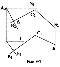 Плоскости, заданные следами, будут параллельны тогда, когда параллельны одноименные (соответствующие) следы этих плоскостей, т.к. следы плоскости мы рассматриваем, как две пересекающиеся прямые: Q1 ‖ S1, Q2 ‖ S2 Þ Q ‖ S 2. Две плоскости взаимно перпендикулярны, если: а) одна из них проходит через перпендикуляр к другой плоскости; б) одна из плоскостей проводится перпендикулярно к прямой, лежащей в другой плоскости. Рассмотрим оба эти случая. Через прямую АВ необходимо провести плоскость Q, перпендикулярную заданной плоскости S (CDE) (рис. 63). Решение задачи сводится к построению перпендикуляра, проведенного из точки А или В на плоскость CDE. В плоскости CDE проведем горизонталь h и фронталь ¦. Из точки В проведем перпендикуляр к фронтали и горизонтали: