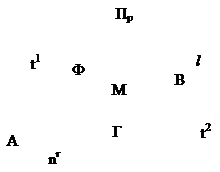 При перемещении точек A и B к точке M секущие будут поворачиваться и, когда эти точки совпадут, займут положение полукасательных t1 и t2. Если точка M обыкновенная, то полукасательные имеют противоположное направление, образуя общую касательную. Через касательную к кривой в данной точке M можно провести бесконечное множество плоскостей. Одна из них называется соприкасающейся плоскостью Г. Положение этой плоскости можно представить себе следующим образом. Каждая секущая и соответствующая ей полукасательная образуют плоскости (aLt1) и (bLt2). При приближении точек A и B к точке M эти плоскости будут поворачиваться и в пределе, когда точки A и B совпадут с M, займут положение соприкасающейся плоскости Г. Рис 124 Через точку M можно провести бесконечное множест- во прямых, перпендикулярных касательной. Все они будут лежать в плоскости Ф (рис. 125), которая называется нормальной плоскостью. Одна из этих нормалей принадлежит соприкасающейся плоскости Г и называется главной нормалью nГ. Другая нормаль, перпендикулярная к соприкасающейся плоскости, называется бинормалью nр. Бинормаль и касательная определяют плоскость Р, которая называется спрямляющей плоскостью (рис. 126).