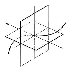 Рис. 125 Рис. 126 Соприкасающаяся Г, нормальная Ф и спрямляющая Р плоскости образуют сопровождающий трехгранник. Локальные свойства кривой в окрестностях точки M исследуют по проекциям линии на плоскостях сопровождающего трехгранника или, что равноценно, с помощью проекций на плоскостях проекций П1, П2 и П3, выбрав их положение параллельно плоскостям Г, Ф и Р (рис. 126). Проекционные свойства пространственных кривых линий во многом аналогичны свойствам плоских кривых. Однако имеются и исключения. Так, например, пространственная кривая линия проецируется только в плоскую кривую, вид точек на проекциях кривых линий может не соответствовать виду самих точек.