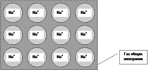 Для металлической связи каждый атом предоставляет в общее пользование некоторое количество электронов (обычно, 1–2). В результате возникает газ общих электронов, заряженный отрицательно, к которому притягиваются положительно заряженные атомные остатки. Металлическую связь образуют элементы с небольшим числом электронов на внешнем уровне. Типичны щелочные металлы (Li, Na, K, Rb, Cs) и некоторые металлы главной подгруппы 2 группы (щелочноземельные металлы Ca, Sr, Ba). У них низкая энергия ионизации и большой орбитальный радиус – электроны слабо удерживаются и легко переходят в общее пользование. Другими словами, у металлов – низкая электроотрицательность. Наличие газа общих электронов объясняет важнейшие свойства металлов: физические (высокие электропроводность, теплопроводность, блеск, пластичность) и химические (восстановительная активность – металлы легко отдают электроны).