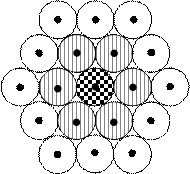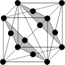 В пространстве вокруг шара можно разместить не более 12 шаров того же размера так, чтобы они касались центрального. На рисунках обычно показывают только центральные части шаров, но имеют в виду, что реально шары касаются друг друга. КЧ=12 наблюдается в гексагональной плотнейшей упаковке (ГПУ) – структуры Mg, Ca, Ti, и кубической плотнейшей упаковке (КПУ) – структуры Cu, Al, Ni. Последней сопоставляют элементарную ячейку, у которой форма куба, а центры атомов расположены в его вершинах и в центрах граней: гранецентрированную кубическую ячейку (ГЦК). Элементарная ячейка – это маленький фрагмент структуры, повторением которого можно заполнить всё пространство.