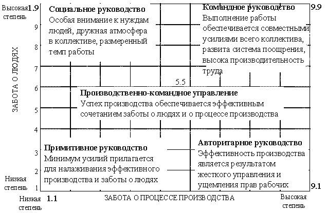 Нужно иметь в виду, что в каждом конкретном случае между авторитарным, демократическим и либеральным (попустительским, бюрократическим) стилями существует определенный баланс, и увеличение доли элементов одного из них будет приводить к уменьшению доли других. Сами же они плавно переходят один в другой На практике «одномерность» руководства предполагает, что используют либо демократический, ориентированный на человеческие отношения, либо авторитарный, ориентированный на работу, стили. Первый вариант характерен сегодня для развитых стран, второй — для развивающихся. Многочисленными исследованиями выяснено, что в современных условиях, как отмечалось, успех дела предопределяется не только личной ориентацией руководителя, но и рядом других обстоятельств: общей ситуацией, характером проблемы, степенью зрелости подчиненных, их отношением к руководителю, готовностью к сотрудничеству, степенью ответственнбсти и т. д. Многомерные стили управления представляют собой комплекс взаимодополняющих, переплетающихся подходов, каждый из которых независим от других и поэтому может реализовываться наряду с ними. Первоначально сложилась идея двумерного стиля управления, основывающегося, с одной стороны, на создании в коллективе благоприятного морально-психологического климата, а с другой — хороших организационно-технических условий, при которых человек достаточно полно сможет раскрыть свои способности. Наиболее простое сочетание этих подходов демонстрирует так называемая «управленческая решетка» Р.Блейка и М. Муттона, приведенная на рис. 1.