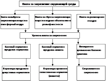 Рисунок 4.3.1. Действующая система формирования платы за загрязнение окружающей среды Плата за загрязнение представляет собой форму возмещения экономического ущерба от выбросов и сбросов загрязняющих веществ в окружающую природную среду Российской Федерации, которая возмещает затраты на компенсацию воздействия выбросов и сбросов загрязняющих веществ и стимулирование снижения или поддержание выбросов и сбросов в пределах нормативов, а также затраты на проектирование и строительство природоохранных объектов. В основу исчисления платы за загрязнение положена система базовых нормативов платы. При расчете нормативов платы за загрязнение принят затратный подход, который исходит из необходимости установить плату за загрязнение, позволяющую возместить финансирование природоохранных мероприятий, нужных для ликвидации ущерба или его предотвращения. Нормативы платы за выбросы, сбросы загрязняющих веществ рассчитывались с учетом токсичных свойств каждого конкретного вещества через показатель его относительной опасности, являющейся величиной, обратной предельно допустимой концентрации вещества в элементе окружающей среды. Показатель относительной опасности i -ого вещества Ai рассчитывается по формуле: Аi = 1/ПДКi, где ПДКi - предельно допустимая концентрация i -ого вещества (для воздуха - среднесуточная, воды - для рыбохозяйственных водоемов). Базовые нормативы платы за выбросы и сбросы конкретных загрязняющих веществ определяются как произведение удельного экономического ущерба от выбросов (сбросов) загрязняющих веществ в пределах допустимых нормативов или лимитов на показатели относительной опасности конкретного загрязняющего вредного вещества для окружающей природной среды и на коэффициенты индексации платы. Базовые нормативы платы за размещение отходов определяются как произведение удельных затрат на размещение единицы (массы) отхода IV класса токсичности на показатели, учитывающие классы токсичности отходов, и на коэффициенты индексации платы. Особенности, связанные с неодинаковыми экологическими и экономическими условиями, учитываются коэффициентами экологической ситуации и значимости состояния атмосферного воздуха и почвы территорий экономических районов Российской Федерации, водных объектов по бассейнам (участкам) основных рек. Базовые нормативы платы за загрязнение (дифференцированные ставки) корректируются с помощью коэффициентов экологической ситуации и значимости, а также ежегодно коэффициентом индексации, значение которого к 1999 г. выросло в 62 раза. Это обусловлено тем, что в последние годы по сравнению с 1991-1992 гг. резко изменились экономические условия, стоимостные и ценовые пропорции, активно развивались инфляционные процессы. Устанавливаются два вида базовых нормативов платы: - за выбросы, сбросы загрязняющих веществ, другие виды вредного воздействия в пределах допустимых нормативов; - за выбросы, сбросы загрязняющих веществ, размещение отходов, другие виды вредного воздействия в пределах установленных лимитов (временно согласованных нормативов). В связи с отсутствием действующих нормативов предельно допустимых объемов размещения отходов, нормативы платы за размещение отходов устанавливаются за объемы размещения в пределах установленных лимитов. В соответствии с Постановлен