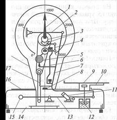 Рис.2. Кінематична схема (а) і загальний ви (б) важільних настільних циферблатних ваг з круговою шкалою 1 - стрілка, 2 - струнка, 3 - зубчаста пара, 4 - шарнірний паралелограм, 5 - квадрантний силовимірювач; 6 - тяга; 7 - вантажоприймальний важіль, 8 - рівень; 9 – вантажоприймальна площадка; 10 - тарувальна камера; 11 - изолир; 12 - масляний заспокоювач; 13 - головний важіль; 14 - плита; 15 - вантаж; 16 - футляр, 17 - тарокомпенсатор; 18 - корпус;
