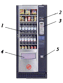 Рис. 21. Торговий автомат фірми Saeco «Вгеак Роіnt 36» 1 — холодильна камера; 2 — дисплей; 3 — монетоприймач; 4 — лоток видачі товару; 5 — вікно видачі здачі