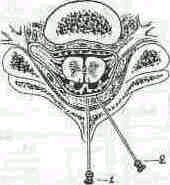 Рис. 48. Способы пункции эпидурального пространства: 1 - срединный; 2- парамедиальный. Положение больного: спину следует немного выгнуть назад, голову опустить так, чтобы подбородок касался груди, а предплечья и кисти свободно свисали вдоль бедер. Возможно положение лежа на боку с приведенными к животу ногами, как при спинномозговой пункции. Для анестезии применяют две иглы - первую для подкожных инъекций, вторую для проведения пункции. После обработки поля антисептиками и местной анестезии 3-4 мл 0,5% раствора новокаина по срединной линии вводят иглу с мандрепом между остистыми отростками и продвигают ее по направлению к твердой мозговой оболочке через кожу с клетчаткой надостную, межостную и желтую связки, после чего проявляется потеря сопротивления. В поясничном отделе игла располагается параллельно остистым отросткам или слегка наклонно к ним. По мере перехода к вышележащим межпозвопковым промежуткам игле следует придать наклонное положение. Это обусловлено особенностями расположения остистых отростков грудных позвонков, которые направлены вниз и кзади (угол наклона иглы в средне-грудном отделе достигает 50-70°) (рис. 49).