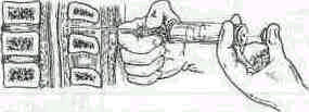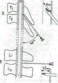 Рис. 49. Направление иглы при пункции эпидурального пространства в грудном (А) и поясни4иом (Б) отделах. Когда игла войдет в толщу связок, извлекают мандрен и присоединяют шприц с анестезирующим раствором. Медленно и плавно проводят иглу глубже, поддерживая одной рукой павильон иглы, а другой надавливая на поршень шприца. При правильном положении и продвижении иглы, когда ее конец проникает в эпидуральное пространство, поршень «проваливается», вводимый раствор вытекает свободно. Перидуралыюе пространство находится на глубине 4-4,5 см от поверхности кожи. У тучных больных это расстояние возрастает на 1,5-2 см (А.Ю.Пащук, 1987). Появление теплой прозрачной жидкости из иглы свидетельствует о проколе твердой мозговой оболочки. Это вынуждает удалить иглу и повторить пункцию на другом уровне. Положение скоса иглы зависит от угла, который образует игла с продольной осью спинномозгового канала. В грудном и шейном отделах позвоночного столба скос иглы должен быть обращен к твердой мозговой оболочке (Лунд, 1975), чтобы уменьшить вероятность ее перфорации. Можно для безопасности введения иглы воспользоваться шприцем с изотоническим раствором хлорида натрия и пузырьком воздуха в нем. Пока конец иглы проходит через связки, поршень шприца при надавливании пружинит, раствор продвигается очень медленно, а пузырек воздуха сжимается. Когда игла проникает в эпидуральное пространство, сопротивление уменьшается, поршень легко продвигается вперед и введение раствора не деформирует пузырек воздуха (рис. 50). После изъятия иглы место прокола герметизируют полосками пластыря.