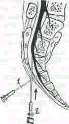 Рис. 52. Положение иглы при выполнении сакральной анестезии в момент прокола крестцово-поясничной мембраны (1); во время введения раствора (2). Если продвижение иглы затруднено, ее извлекают и меняют направление. Иглу не следует вводить далее S„ во избежание прокола дурального мешка. Эффект правильной каудальной анестезии проявляется в ослаблении анального рефлекса, гипалгезии промежности, ощущении тепла в нижних конечностях.