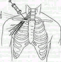 Анестезия плечевого сплетения по Куленкампфу (надключичный способ) Показания: травма верхней конечности; оперативные вмешательства на верхней конечности у пожилых пациентов, а также у больных, которым противопоказано общее обезболивание из-за сердечно-сосудистой или дыхательной патологии. Больного укладывают на спину, голову поворачивают в противоположную сторону. Над серединой ключицы определяют пальпацией пульсацию подключичной артерии. Кнаружи и кзади от нее располагаются ветви плечевого сплетения. Левым указательным пальцем кнаружи от середины ключицы вниз и кзади оттесняют подключичную артерию. После анестезии кожи у верхнего края ключицы иглу продвигают кзади вниз и кнутри под углом 30° до упора в I ребро. Отодвинув иглу чуть назад, направляют ее вдоль ребра кверху. Встреча конца иглы с нервным стволом проявляется в виде стреляющей боли («удар электрическим током») по ходу руки (об этом надо предупредить больного), на что больной отве- чает двигательной реакцией. Раствор анестетика вводят только после наступления парестезии. Проверяют положение иглы. Если из ее просвета не появляется кровь, вводят 20-25 мл 1% раствора новокаина. Анестезия наступает через 10-15 минут (рис. 53). В некоторых случаях остается без анестезии внутренняя поверхность кожи плеча, т.к. имеется соединительная ветвь от межреберных нервов.