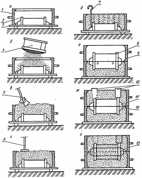 Рисунок 7. Інструмент для ручної формовки: а – сито; б – совкова лопата; в – ручні трамбівки; г – гладилки; д – кутові гладилки; е – крючок; ж – формувальний ніж; з – фігурні ложки; и – стальні голки. Порядок операцій при формовці по суцільній моделі (починається з нижньої напівформи) (рис.8): 1) На підмодельну плиту встановлюють модель і елементи ливникової системи. 2) На плиту встановлюють опоку низу. 3) Модель обприскують розділовим покриттям. 4) В опоку насипають облицювальну суміш шаром 50-70мм і ретельно ущільнюють, поки модель не буде повністю покрита сумішшю. Решту об’єму опоки заповнюють наповнювальною сумішшю шарами 50-70мм з ущільненням кожного шару. 5) Зрізають надлишок суміші зверху опоки металічною рейкою або лінійкою. 6) Виконують вентиляційною голкою наколи так, щоб вони не доходили до моделі на 15-20мм. 7) Знімають опоку з підмодельної плити, перевертають на 180о і знову ставлять на плиту. 8) На півформу низу по центруючи пристроях встановлюють опоку верху і моделі ливникової системи. Півформу низу навколо моделі присипають сухим розділовим піском 9) Модель обприскують, насипають шар облицювальної суміші 50-70мм і ретельно ущільнюють. 10) Решту об’єму опоки заповнюють наповнювальною сумішшю шарами 50-70мм з їх наступним ущільненням. 11) Знімають надлишок суміші зверху опоки. 12) Виконують вентиляційні наколи, виймають модель стояка. 13) Півформу верху знімають, перевертають на 180о, встановлюють на вільне місце. 14) З півформи низу виймають модель, заздалегідь розштовхавши її. Одержаний відбиток оглядають, при необхідності ремонтують, встановлюють стержні (якщо вони є), продувають стиснутим повітрям. 15) Опоку верху перевертають на 180о і по центруючи пристроях встановлюють на півформу низу. 16) Півформи скріплюють або навантажують. Форма готова до заливки.