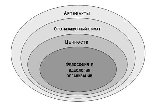 Организационная культура — это достаточно аморфное образование, и иногда трудно выделить те части и элементы, которые можно было бы отнести только к ней. Кроме того, границы некоторых понятий тоже определены недостаточно четко, что создает трудности при выделении элементов организационной культуры. Обобщая результаты многочисленных исследований, можно выделить четыре подсистемы (слоя) организационной культуры, которые определенным образом соотносятся между собой (рис. 1.).