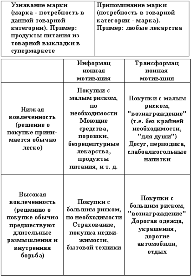 Ухвалення рішення про покупку Модель послідовної поведінки допомагає виявити особливості процесу ухвалення рішення про покупку і визначити ролі учасників. Виділяються наступні ролі в процесі ухвалення рішення про покупку товару: o ініціатор, що озвучує потреба в певній товарній категорії; o експерт -консультант, оцінює різні марки й виносить судження на їхній рахунок o той, який приймає рішення про покупку, вибирає конкретну марку; o особа, яка оплачує покупку - здійснює придбання товару в реальному часі; o користувач, для якого був придбаний цей товар. Зазначені ролі можуть виконуватися як різними людьми, так і однією людиною одночасно. Рішення про покупку чаші всього приймається: o дома - контакт із рекламою, споживання продукту; o у місці покупки - планований захід у магазин (швидше за все з певною метою), незапланований захід; o на роботі - контакт із рекламним повідомленням, комерційна пропозиція й т.д.. Фактори, що впливають на місце ухвалення рішення про покупку: o легкість контакту з рекламним повідомленням; o контакт з індивідами, що грають в ухваленні рішення інші ролі; o наявність або відсутність часу на роздуми; o психічний і фізичний стан індивіда. Комунікаційні ефекти – це стійкі асоціації в думках потенційного покупця, пов’язані з рекламованою торговою маркою. Виділяють п’ять основних комунікаційних ефектів: o потреба в товарній категорії - усвідомлення цільовою аудиторією необхідності в товарі або послузі, що дозволяє задовольнити потребу; o поінформованість про марку - здатність покупця ідентифікувати торгову марку усередині товарної категорії в достатньому об’ємі для того, щоб зробити покупку. Поінформованість ділиться на 2 складові: - впізнавання. Воно відбувається в місці продажів, і в рекламі повинна бути детально показане упакування; - пригадування. Воно відбувається за якийсь час до придбання продукту, і в рекламі повинен демонструватися спосіб рішення проблеми за допомогою товару; o установка до торгової марки (відношення) - оцінка споживачем стосовно здатності рекламованої торгової марки задовольнити наявну потребу краще ніж інші конкуруючі марки в цій категорії; o намір до здійснення покупки товару - рішення споживача придбати товар або почати інші дії, пов'язані з покупкою. Матриця Россітера - Персі допомагає визначити зміст реклами для всіх видів товарів і послуг. Вона заснована на розгляді співвідношення: o установки до торгової марки; o мотивації споживача при здійсненні покупки. Установка – передумова ухвалення рішення про покупку, пов'язаного з ризиком (економічним або психологічним). Може бути: o низкою ( рішення про покупку приймається легко); o високою (рішення довго обмірковується). Мотивація - це "причина", що спонукує споживача зробити покупку. Може бути: o інформаційною (товар купується по необхідності); o трансформаційною (товар купується для задоволення потреб більше високого рівня).