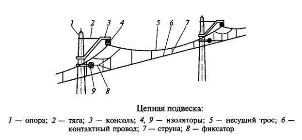 На тепловых, гидравлических и атомных электростанциях вырабатывается трехфазный переменный ток напряжением 6...21 кВ и частотой 50 Гц. Для передачи электрической энергии к потребителям напряжение на трансформаторных подстанциях повышают до 750 кВ в зависимости от протяженности высоковольтных линий электропередачи (ЛЭП). Вблизи мест потребления электроэнергии напряжение понижают до 110... 220 кВ и подают в районные сети, к которым наряду с другими потребителями подключены тяговые подстанции электрифицированных железных дорог и трансформаторные подстанции дорог с тепловозной тягой. Железнодорожные линии снабжают системой однофазного переменного тока, а на локомотивах устанавливают специальное оборудование, преобразующее переменный ток в постоянный. На железных дорогах, электрифицированных на постоянном токе, тяговые подстанции выполняют две функции: понижают напряжение подводимого трехфазного тока и преобразуют его в постоянный. Все оборудование, подающее переменный ток, размещается на открытых площадках, а выпрямители и вспомогательные агрегаты — в закрытых помещениях. От тяговых подстанций электроэнергия поступает в контактную сеть по питающей линии — фидеру. На железных дорогах, электрифицированных на переменном токе тяговые подстанции только понижают напряжение до 25 кВ, поэтому их техническое оснащение проще и дешевле, чем у тяговых подстанций постоянного тока. Для размещения оборудования на тяговых подстанциях при переменном токе используют открытые площадки. Контактная сеть — это совокупность проводов, конструкций и оборудования, обеспечивающих передачу электрической энергии от тяговых подстанций к токоприемникам электрического подвижного состава. Основным требованием к конструкции контактной сети является обеспечение надежного постоянного контакта провода с токоприемником независимо от скорости движения поездов, климатических и атмосферных условий. В контактной сети нет дублируемых элементов, поэтому ее повреждение может повлечь за собой нарушение установленного графика движения поездов. В соответствии с назначением электрифицированных путей используют простые и цепные воздушные контактные сети. На второстепенных станционных и деповских путях при сравнительно небольшой скорости движения может применяться простая контактная подвеска, представляющая собой свободно висящий провод, который закреплен на опорах.