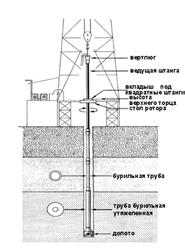 При бурении вращательным способом необходимо, чтобы разрушающему инструменту (долоту) передавались вращательное движение и нагрузка, обеспечивающая достаточный нажим на разрушаемый интервал. Кроме того, необходимы условия для удаления разрушенных частиц вещества (породы). Поэтому скважина оборудуется ротором, вертлюгом с буровым шлангом, буровыми насосами и колонной бурильных труб. Если долота вращаются не с поверхности земли (ротором), а непосредственно на забое, кроме перечисленного оборудования, используют турбобуры или электробуры.
