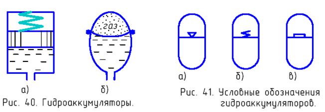 Теплообменники служат для охлаждения (рис.39, б) или нагрева (рис.39, в) рабочей жидкости. Они, как и фильтры, предназначены для обеспечения определенных свойств рабочей жидкости (кондиции), поэтому их относят к кондиционерам. Гидроаккумуляторы - устройства для накапливания энергии рабочей жидкости с целью дальнейшего её использования. По способу накапливания энергии они бывают: - пневматические (аккумулирование энергии за счет сжатия газа); - пружинные (аккумулирование энергии за счет сжатия пружины); - грузовые (аккумулирование энергии за счет изменения потенциальной энергии груза) - применяются редко.