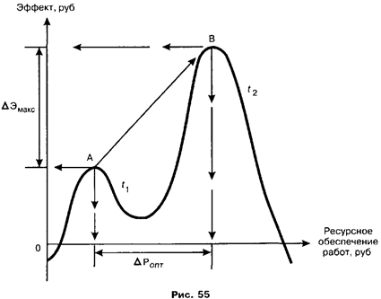По оси абсцисс обычно откладывается ресурсное обеспечение работ (например, в рублях); по оси ординат — результаты деятельности организации (в качестве которых может выступать прибыль или любой другой показатель эффективности). Например, временно приостановившая производство фирма продолжает хранить запасы, платит некоторые виды налогов и т.д. Ресурсное обеспечение работ в этом случае отсутствует, но имеются определенные затраты на поддержание жизнедеятельности. Эффект (измеренный прибылью) в этом случае будет отрицательным (точка 1). По мере роста ресурсного обеспечения работ фирма будет производить товар и получать прибыль. Эффективность ее деятельности возрастает, и фирма смещается в точку 2. Дальнейшее увеличение ресурсного обеспечения работ, очевидно, приведет фирму к максимальной эффективности Эмакс (точка 3) и оптимальному расходу ресурсов Ропт. Предположим, что ресурсное обеспечение работ необдуманно увеличивается. Очевидно, что в этой ситуации будет возрастать и расходная часть бюджета фирмы, а прибыль будет уменьшаться. Эффективность ее деятельности уменьшается (точка 4) и в какой-то момент становится отрицательной (точка 5). Чем уже оптимизационная кривая, тем выше сложность управления фирмой, тем труднее поддерживать ее максимальную эффективность. Работа в области экстремальной эффективности (Эмакс) требует от руководства быстрых и грамотных решений, время реагирования на изменения ситуационных факторов сводится к минимуму. Каждая организация должна знать свои потенциальные возможности и периодически пересматривать оптимизационные кривые. Информационной базой для такого рода деятельности являются бизнес-планы, стратегические, инновационные и инвестиционные планы, балансы, аналитические материалы. Важно постоянно следить за динамикой ресурсного обеспечения и эффекта (см. рис.55). Такой мониторинг позволит увидеть, как развивается организация, по интенсивному или экстенсивному пути. Например, зная свою оптимизационную кривую за прошлый год (t1), фирма решает увеличить объемы производства (рост потребностей на рынке стимулирует этот процесс). Очевидно, ей требуются дополнительные ресурсы, что может привести к снижению эффекта на прошлогодней оптимизационной кривой. Поэтому фирма планирует предпринять ряд качественно-новых организационных и технологических изменений, позволяющих сместить максимум оптимизационной кривой вправо вверх (t2) от точки А к точке В. Таким образом, приращение ресурсного обеспечения DРопт должно выразиться в приросте эффективности DЭмакс.