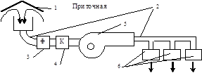 1 - Воздухоприемник 2 - Трубопровод 3 - Фильтр счистки 4 - Калорифер 5 - Вентилятор 6 - Воздухонасадки с отверстиями