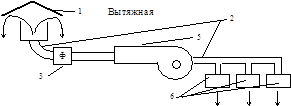 Диффузор Обечайка Защитный колпак Конус Трубопровод Дефлектор: специальная насадка, установленная на трубопровод и использующая энергию ветра. Применяют для удаления загрязненного и перегретого воздуха из помещения небольшого объема, а также используют при местной вентиляции. Ветер, обдувая слово 2, создает на ее поверхности разряжение, вследствие чего воздух движется из помещения по трубопроводу 5 и выходит наружу через кольцевые щели, образованные между обечайкой 2, краями колпака 3 и корпусом диффузора. Система движения воздуха, которая осуществляется вентиляторами. Существуют приточная и вытяжная вентиляция.
