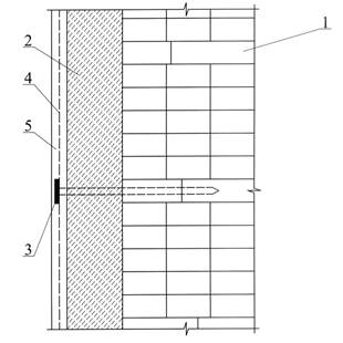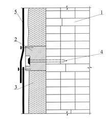 Рис. 5.3. Вариант отделки фасада мокрой штукатуркой по пластмассовой сетке при утеплении стены снаружи: 1 – стена; 2 – утеплитель; 3 – тарельчатый дюбель; 4 - пластмассовая сетка; 5 - штукатурка