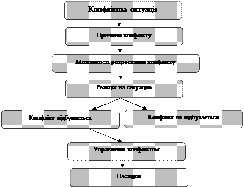 Людина постійно вступає у відносини з іншими людьми. Від того, як буде налагоджене спілкування з людьми, залежить соціальна комфортність і результативність нашої діяльності. Вирішення конфліктних ситуацій має дуже велике значення. Конфлікт означає зіткнення протилежних інтересів, відсутність згоди між сторонами ділового контакту. Вважається, що конфлікт завжди небажаний, оскільки завдає шкодить людям, негативно позначається на результатах спільної роботи, погіршує, а іноді і руйнує ділові взаємини. Класична точка зору на конфлікт полягає в тому, що йому взагалі немає місця. Але тепер визнано, що визначена ступінь конфліктності в соціальних відносинах просто неминуча. У вирішенні конфлікту головну роль грає етика менеджменту. І в рамках сучасного менеджменту сьогодні вже існує спеціальна наука – конфліктологія. Вона допомагає в управлінні поводженням людей в особливих ситуаціях, у врегулюванні відносин, указує шляхи виходу з тієї або іншої ситуації. Найпоширеніше визначення конфлікту наступне: конфлікт – це відсутність згоди між двома або більше сторонами. Одна сторона намагається нав'язати свої погляди і перешкодити іншій стороні зробити те ж саме. Кожна сторона робить усе, щоб була прийнята її точка зору, відмінна від точки зору і цілей іншої сторони. Зародження і розвиток конфлікту можна охарактеризувати наступною схемою:
