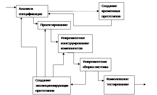 Рис.4. Модель ЖЦ, сочетающая временные прототипы и инкрементную разработку Недостатки модели: · все возможности системы предопределены изначально; · ограниченные возможности долговременного привлечения ресурсов (средств или персонала). Преимущества: · изначальное определение возможностей системы; · пригодность для использования промежуточного продукта; · естественное разделение системы на наращиваемые компоненты (инкременты); · привлечение персонала и средств по мере необходимости; · необходимая обратная связь с пользователем для полного понимания требований; · упрощение надзора за изменением технологии.