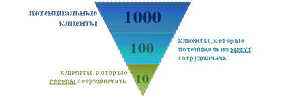 Заключение сделки – это основной элемент переговоров. Перед заключением сделки всегда необходимо взять паузу для того, чтобы осмыслить (проанализировать) следующие вопросы: 1. Соответствует ли заключаемое соглашение вашим личным целям? 2. Соответствует ли соглашение целям и пределам, установленным вами до переговоров? 3. Можете ли вы полностью выполнить свою часть соглашения? 4. Намерены ли вы исполнять свои обязательства в полном объеме? 5. С учетом имеющейся у вас информации, как вы думаете, выполнит ли противоположная сторона свои обязательства в том объеме, как это обсуждалось при переговорах? 6. Намерена ли противоположная сторона выполнять свои обязательства? Для заключения сделки необходимо получить положительный ответ по всем шести пунктам. Если есть сомнения, то необходимо вернуться к уточнению условий. Хорошая сделка – это та сделка, которая хороша при любых обстоятельствах и в течение всего времени действия соглашения. Плохая сделка – это та сделка, которая хороша, но не при любых обстоятельствах, т.е. в ней потенциально заложен риск конфликтной ситуации (неисполнения обязательств и т.п.). Заключение сделки – это любое окончание переговоров, а не только их удовлетворительное разрешение. В этом смысле отказ от сделки – это тоже результат переговоров. При отказе от сделки важно: - зафиксировать причину отказа, т.е. понять, в какой части ваше предложение было неконкурентным; - договориться с клиентом (предложить вернуться к рассмотрению сотрудничества несколько позже). Работа руководства отдела продаж – это мониторинг отказов. «Воронка продаж»: