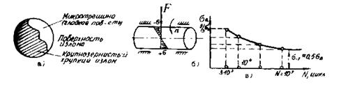 Рис 64. Способность материалов выдерживать не разрушаясь переменные нагрузки, называют сопротивлением усталости. Его оценивают с помощью предела выносливости – σr, который определяюn экспериментально при динамических испытаниях. Следовательно, при переменных напряжениях достижение предела выносливости опасно как и достижение предела прочности при статических напряжениях. Наиболее опасным является симметричный (знакопеременный) σr = σ-1 Испытания проводят не менее, чем на 8... 10 образцах, каждый из которых подвергают действию переменных напряжений. Цель испытания определить величину σ-1 (Рисунок 64. б). Кривую, построенную по экспериментальным данным, называют кривой усталости или кривой Веллера (Рисунок 64. в). Первый образец нагружают нагрузкой (2/3)σв. Образец испытывают до поломки (допустим до 3 • 103 циклов нагружения). Следующий образец нагружают нагрузкой меньшей на 15 %, чем первый. Допустим, разрушение наступило через 104 циклов; еще уменьшают нагрузку и т.д. Испытания прекращают при базовом числе циклов: N = 107 для пластических материалов. Наибольшее значение максимального напряжения цикла, которое образец выдерживает базовое число циклов испытаний, называют пределом выносливости. Иногда σ-1 определяются по эмпирическим зависимостям. Величину предела выносливости определяют на цилиндрических полированных образцах с диаметром 7,5 или 10мм. На предел выносливости конкретных деталей, работающих в реальных условиях, влияет ряд факторов. Поэтому, при определении предела выносливости, вводят поправочные коэффициенты: 1)Масштабный эффект учитывает влияние на предел выносливости размера сечений деталей. Согласно статистической теории разрушения при увеличении абсолютных размеров деталей возрастает вероятность попадания дефектных зерен в зону концентрации напряжений. Коэффициенты масштабного эффекта: