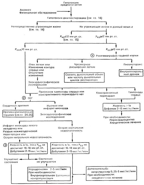 Третья часть, описывающая лечение гипотензий, включает описание случаев с повышенным давлением наполнения левого предсердия (определяемого по уровню капиллярною давления заклинивания Ркз). 1. Одной из причин гипотензии является высокое внутригрудное давление, действующее на камеры сердца, при одновременном увеличении давления в правом предсердии (Рпп) и Ркз. В числе возможных причин повышения внутригрудного давления следует назвать: пневмоторакс или пневмомедиастинум, перераздувание легких при ИВЛ положительным давлением, перикардиальную или медиастинальную тампонаду, а также констриктивный перикардит. Перераздувание легких может быть следствием повышенной частоты дыхания или чрезмерного дыхательного объема при проведении ИВЛ; газ, который задерживается в альвеолах при выходе, увеличивает функциональную остаточную емкость легких, повышает альвеолярное давление на выдохе («скрытое» положительное давление в конце выдоха), приводя, таким образом, к возрастанию внутригрудного давления. Купировать это состояние можно уменьшением частоты или объема ИВЛ. Медиастинальную или перикардиальную тампонаду (например, сгустком крови) можно распознать по появлению парадоксального пульса при спонтанной вентиляции и, возможно, по противоположному эффекту на фоне проведения ИВЛ. Наряду с Рпп и Ркз конечное диастолическое давление в левом и правом желудочках при тампонаде и констриктивном перикардите становятся почти равными. Иногда отличить тампонаду сердца от констриктивного перикардита помогает обнаружение жидкости при эхокардиографическом исследовании. В обоих случаях в/в введение жидкости и дофамина позволяет выиграть время для проведения перикардиоцентеза либо оперативного вмешательства. Изадрин назначают для поддержания давления при неэффективности дофамина, так как повышение частоты сердечных сокращений лучше отражается на сердечном выбросе в условиях уменьшения объема камер сердца. 2. Другие, приводящие к развитию гипотензии и повышению Ркз заболевания не всегда сопровождаются повышением давления в правом предсердии; Рпп чаще бывает повышено на фоне значительного ухудшения функции левого сердца. Инфаркт миокарда левого желудочка приводит к повышению Ркз, но при этом Рпп нередко остается нормальным. Эхокардиографическое исследование позволяет распознать такие анатомические дефекты, как разрыв клапана или межжелудочковой перегородки; для последнего состояния имеется патогномоничный признак - повышение напряжения кислорода в правом желудочке. 3. Лечение гипотензии на фоне ишемии или инфаркта миокарда начинают с в/в введения жидкости, чтобы поднять Ркз до оптимального уровня, равного 16 18 мм рт.ст. При необходимости начинают введение добутамина, который предпочтительнее дофамина, так как он снижает Ркз и реже вызывает тахикардию. Упорную гипотензию можно устранить с помощью кратковременной инфузии гидротартрата норадреналина. Целесообразно также проведение внутриаортальной баллонной контрапульсации, что позволяет увеличить диастолу, уменьшить пресистолическую нагрузку и частично снизить систолическую нагрузку. Затем гидротартрат норадреналина следует заменить нитропруссидом для дальнейшего снижения системного сосудистого сопротивления. Устойчивый уровень системной перфузии можно оп