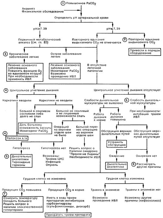 Главным при ведении всех больных с гиперкапнией остается коррекция неизбежной у них гипоксемии при дыхании атмосферным воздухом. В то же время повышать FiO2 следует с осторожностью во избежание сопутствующего возрастания РаСО2. 1. Под гиперкапнией понимают напряжение СО2 в артериальной крови, превышающее верхнюю границу допустимых значений, т.е. на высоте уровня моря больше 44 мм рт. ст. Прежде чем констатировать гиперкапнию, необходимо исключить неправильную маркировку проб крови, пункцию вены вместо артерии, а также неточности измерения. Определить значения рН артериальной крови (> 7,39), соответствующие первичному метаболическому алкалозу, можно лишь при уверенности в том, что полученные данные отражают хроническое состояние больного. Транзиторное улучшение вентиляции при заборе пробы крови может превратить, например, истинный частично компенсированный ацидоз в явный первичный метаболический алкалоз. Первичный метаболический алкалоз не требует принятия неотложных мер. И хотя сопутствующая гипоксемия нуждается в коррекции, но сам алкалоз не является острым угрожающим жизни состоянием. Компенсаторная гиповентиляция может привести к развитию ателектаза и в ряде случаев требует лечебного вмешательства. 2. Респираторный ацидоз может возникать при повторном поступлении в легкие выдыхаемого СО2 вследствие случайного прекращения подачи газа к кислородной маске, либо в результате ошибки при сборке выдыхательного клапана респиратора. 3. Гиперкапния встречается у больных с хроническим бронхитом гораздо чаще, чем при эмфиземе. Спровоцировать ее проявление может повышение FiO2, введение седативных или наркотических препаратов, а также состояние сна. Следует осторожно повышать фракцию кислорода в дыхательной смеси до достижения безопасности уровня РаО2 (40 мм рт. ст.). В острой стадии легочного заболевания, за исключением тяжелых случаев, гиперкапния встречается редко; однако наступившая гиперкапния, кроме случаев, когда больному вводили седативные либо наркотические препараты, требует эндотрахеальной интубации и проведения ИВЛ в режиме перемежающегося положительного давления. 4. К признакам, позволяющим заподозрить угнетение центральной регуляции дыхания, относят низкую частоту дыхательных движений, отсутствие диспноэ, а также снижение уровня сознания больного. Диагностика затрудняется тем, что даже у здоровых субъектов повышение РаСО2 в дыхательной смеси более 80 мм рт. ст. вызывает угнетение психической деятельности и иногда даже кому. Частой причиной центрального угнетения дыхания являются наркотики. Эффективность налоксона, снижающего патологически повышенное РаСО2, была показана вплоть до 10-го дня после введения наркотических препаратов. Хотя действие налоксона может быть обусловлено его антагонизмом по отношению к эндорфинам, следует обратить внимание на возможную эффективность этого препарата у больных с гиперкапнией различного генеза. 5. Причиной гиперкапнии при гипотиреозе является обструкция верхних дыхательных путей, центральное угнетение дыхания, а также слабость периферической мускулатуры. Снижению РаСО2 способствуют стимуляторы дыхания (например, medroxyprogesterone, протриптилин, меридил)*, а также заместительная терапия препаратами гормонов щитовидной железы. Проклятие Ундины — синдром, при котором