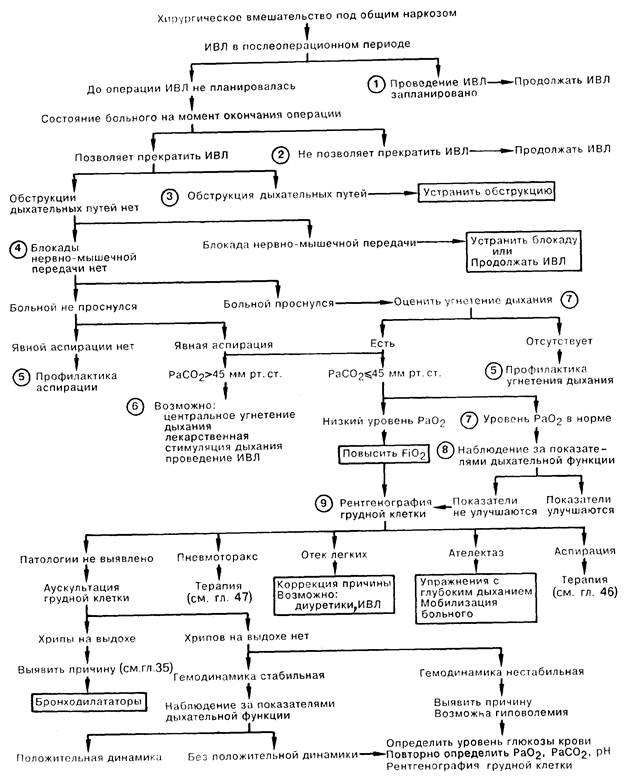 1. Плановую послеоперационную ИВЛ можно рекомендовать больным с заболеваниями сердца и ЦНС, так как она позволяет избежать гипоксии или респираторного ацидоза, а также предупредить или отсрочить начало острого легочного заболевания. Показания к ИВЛ определяются характером оперативного вмешательства (операция с использованием аппарата искусственного кровообращения; крупная операция на органах брюшной полости) или предоперационным состоянием больного (ожирение или выраженное хроническое заболевание легких). 2. По итогам операции проведение ИВЛ может быть показано в следующих ситуациях: длительное и сложное вмешательство, значительная кровопотеря, нестабильная гемодинамика, медленное восстановление спонтанного дыхания после введения миорелаксантов или даже в том случае, если операция закончилась в конце рабочего дня. 3. Лечение обструкции дыхательных путей зависит от характера вызвавших ее причин, например западение языка, попадание инородного тела или сгустка крови, отек или спазм гортани, паралич возвратного гортанного нерва, аспирация желудочного содержимого или компрессия трахеи объемным образованием в области шеи (например, гематомой). 4. У больных, которым вводились нарушающие нервно-мышечную передачу препараты, в первую очередь следует предположить стойкую блокаду нервно-мышечных синапсов. Пролонгированное действие миорелаксантов может объясняться наличием почечной или печеночной недостаточности, повышением температуры больного, низкой активностью псевдохоли нэстеразы крови, введением препаратов с побочным эффектом блокады нервно-мышечной передачи (неомицин, гентамицин) либо изменением рН и РСО2 артериальной крови. Признаками пролонгированной блокады могут быть: потеря координации движений, неспособность больного поднять голову с подушки, а также втяжение межреберных промежутков. Подтвердить это нарушение можно с помощью стимуляции нерва, при которой определяется затухающее посттетаническое облегчение. 5. Описано много различных вариантов ведения больных с целью снижения частоты и выраженности послеоперационных легочных осложнений. Не имеется четких доказательств преимущества какого-то одного из этих вариантов перед другими. Чаще всего рекомендуется ранняя мобилизация больного, а также поощрение глубокого дыхания и кашля. 6. Часто причиной центрального угнетения дыхания бывает действие анестетиков. Наркотики могут угнетать дыхание даже у бодрствующего больного. При необходимости вводят налоксон, однако для достижения адекватной аналгезии иногда можно примириться с умеренной и стабильной гиперкапнией. Угнетение спонтанного дыхания иногда наблюдается после оперативных вмешательств на верхних отделах шеи — синдром проклятия Ундины; обычно это состояние проходит само по себе, но требует проведения ИВЛ до полного восстановления дыхания. 7. «В норме» РаСО2 после хирургического вмешательства ниже, чем в предоперационном периоде. Выраженность и продолжительность снижения РаО2 прямо зависят от близости места оперативного вмешательства к диафрагме, а также от длительности операции. Гипоксемия связана со снижением функциональной остаточной емкости легких, но точный ее механизм неясен. 8. Признаками угнетения дыхания являются диспноэ, тахипноэ, тахикардия, гипо- и гипертензия, втяжени