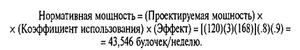 Нормативная мощность — это измеритель максимума мощности на отобранных производствах. Нормативная мощность будет всегда ниже или эквивалентна проектируемой мощности. Для расчета нормативной мощности выполняется действие: Нормативная мощность = (Проектируемая мощность) х (Коэффициент использования) х (Эффект) Мы определим нормативную мощность в следующем примере. Пример 1. Предприятие, производящее булочки для завтрака, имеет оборудование с эффектом 90% и коэффициентом использования мощности 80%. Три производственные линии используются для производства булочек. Линии работают 7 дней в неделю по три восьмичасовых смены в день. Каждая линия спроектирована на изготовление 120 стандартных булочек в час. Какова нормативная мощность? При расчете нормативной мощности, мы умножаем проектируемую мощность (которая равна числу линий на время работы линии в часах и на число булочек в час) на коэффициент использования и эффект. Оборудование используется семь дней в неделю, по три смены в день. Таким образом, каждая производственная линия работает 168 часов в неделю (168 = 7 дней х 3 смены х 8 часов в смену). По этой информации нормативная мощность может быть определена формулой: