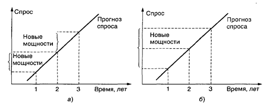 Поскольку нормативная мощность может быть спрогнозирована, следующий шаг — определение размера прибыли от каждого добавления мощности. Для этого сделаем предположение, что служба менеджмента знает технологию и тип оборудования, которое будет применено для удовлетворения будущего требуемого спроса.Рис. показывает, как новая мощность может быть спланирована для будущего роста спроса. Как показано на рис. а, новые мощности приобретаются к началу следующего года. Эти мощности будут достаточными для управления возрастающим спросом до начала второго года. К началу второго года, новые мощности снова приобретаются, что позволит организации удовлетворить спрос к началу третьего