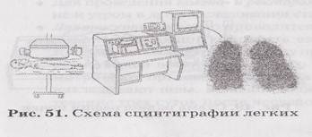Сцинтиграфия — более совершенный метод, который позволяетляет одновременно отражать анатомические особенности органа и процесс транзита через орган РПФ, то есть совмещать возможности ранее описанных метО дов. Ход исследования контролируется компьютером (рис. 51). Радиоизотопные методы используются в клинической практике для исследования печени, желчного пузыря, почек, щитовидной и поджелудочной железы, сердца и др.(рис.52).