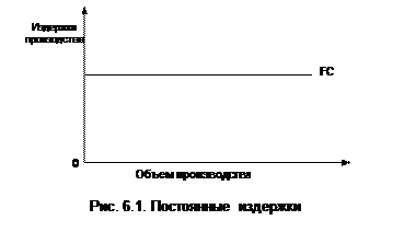 В краткосрочном временном периоде часть ресурсов остается неизменным, а часть меняется для увеличения или сокращения совокупного выпуска. В связи с этим в краткосрочном периоде экономические издержки подразделяются на постоянные и переменные издержки. Постоянные издержки не изменяются в ответ на изменение объема выпуска продукции. Они составляют большую часть затрат и включают затраты на сооружения, станки, оборудование, оплату процентов по кредитам, оплату управляющего персонала и т.д. Условным обозначением постоянных издержек является сочетание букв FC. Зависимость динамики постоянных издержек в ответ на изменение объема выпуска продукции может быть представлена графически (рис. 6.1).