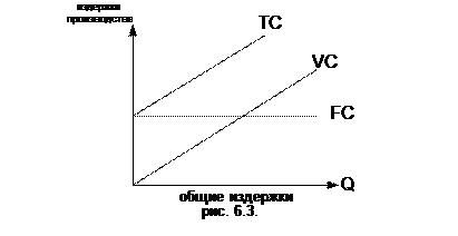 Постоянные и переменные издержки в сумме составляют совокупные или валовые издержки производства. Совокупные издержки включают совокупные постоянные и совокупные переменные издержки. Условным обозначением совокупных издержек производства является сочетание букв ТС. Графически зависимость совокупных издержек от динамики выпуска продукции может быть показана на основе наложения друг на друга графика постоянных издержек и графика переменных издержек (рис. 6.3).