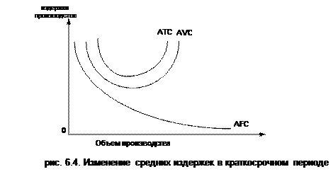 Что касается средних постоянных издержек, то по мере роста объема производства они непрерывно понижаются, поскольку они распределяется на все большее и большее количество единиц продукции. Наглядно особенности изменения средних издержек в зависимости от количества произведенной продукции в краткосрочном периоде показаны на рис. 6.4.