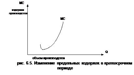 Предельные издержки – дополнительные издержки, связанные с увеличением производства данного товара на единицу. Обозначаются они сочетанием букв МС. По мере увеличения количества производимой продукции предельные издержки, аналогично средним общим и средним переменным издержкам, сначала имеют тенденцию к снижению и только по достижении определенного уровня объема производства начинают возрастать. При этом стадия возрастания таких издержек имеет более ярко выраженный характер и имеет более высокие темпы роста, чем динамика средних общих и средних переменных издержек. Графически изменения предельных издержек в ответ на изменение выпуска продукции имеют следующий вид (рис. 6.5).