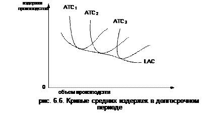 Нетрудно заметить, что изменение объема производства в краткосрочном периоде связано с изменением переменных издержек. Реакция выпуска продукции на изменение переменных затрат определяется законом убывающей отдачи или убывающей производительности. Закон убывающей отдачи отражает связь между увеличением производства и затратами переменного фактора при неизменности всех других факторов. Согласно этому закону увеличение производства, достигаемое при равномерном приросте переменного фактора по достижению определенного уровня, приведет к последовательному снижению отдачи от этого фактора и сокращению объема выпуска продукции. Закон убывающей отдачи применим только к условиям краткосрочного периода. В долгосрочном временном периоде изменения в объемах выпуска продукции могут сопровождаться изменениями объемов не только переменных, но и постоянных затрат. Иными словами, все издержки в долгосрочном периоде будут выступать в качестве переменных. Закономерностью изменения долгосрочных средних издержек является их первоначальное снижение с расширением производственных мощностей и ростом объема производства. Однако в итоге ввод все больших и больших мощностей приведет к росту долгосрочных средних издержек. Графическим выражением связи между средними издержками и объемом выпуска в рамках длительного периода является кривая долгосрочных средних издержек. Соединив точки минимума ATC, ATC2, ATC3…ATCn, получим кривую долгосрочных средних издержек LAC (рис. 6.6).