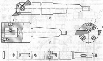 При обработке отверстий и плоскостей, расположенных под углом к основанию заготовки или друг к другу, применяют угольники. Заготовки с опорными поверхностями цилиндрической формы устанавливают на призмы. Корпусные детали отличаются большим многообразием форм и размеров обрабатываемых поверхностей и точностью их обработки. В зависимости от этого используют различные конструкции расточных кондукторов для закрепления корпусных заготовок и обеспечения правильного положения инструмента относительно обрабатываемой поверхности. Режущий инструмент на расточных станках закрепляют с помощью вспомогательного инструмента: консольных оправок (рис. 3.8, а, б), двухопорных оправок (рис. 3.8, в) и патронов. Использование вспомогательного инструмента обусловлено тем, что резец нельзя непосредственно закреплять в расточном шпинделе или на радиальном суппорте. Расточные оправки имеют прямоугольные, квадратные или круглые окна, расположенные под углом 45 или 90° к оси оправки, для установки резцов. Короткие консольные оправки предназначены для закрепления одного или двух резцов при растачивании глухих и сквозных отверстий небольшой длины.