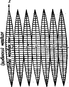 Рис. 2.4. Изображение координатных зон на плоскости в проекции Гаусса-Крюгера