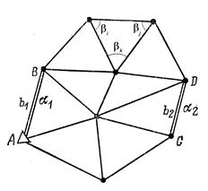 Геодезических сетей Лекция 4. Методы, программы создания и модернизация Плановые геодезические сети могут быть созданы наземными и спутниковыми методами. К наземным методам создания этих сетей относятся методы триангуляции, полигонометрии и трилатерации, а также методы геодезических засечек и проложения теодолитных и мензульных ходов. Последние три метода используются исключительно в топографии и инженерной геодезии. Поэтому в рамках данного курса ограничимся рассмотрением триангуляции, трилатерации и полигонометрии, а также идеи спутникового метода, ставшего в последние годы основным при создании плановых государственных геодезических сетей. Дадим краткую характеристику каждого метода. В методе триангуляции на командных высотах местности закрепляют систему геодезических пунктов, образующих сеть треугольников (рис. 4.1). В каждом треугольнике этой сети измеряют все три горизонтальных угла β. Результаты угловых измерений в сети триангуляции подвергаются специальной математической обработке, в процессе которой получают уравненные значения плановых координат пунктов. Для определения плановых координат пунктов в сети триангуляции должны быть известны как минимум координаты x, y одного пункта сети, длина базисной стороны b и дирекционный угол α этой стороны. Для контроля число исходных данных может быть увеличено. Так на рис.4.1 показано, что в качестве исходных заданы координаты x, y пункта А, дирекционные углы α1, α2 и длины b1, b2 сторон AB и СD (базисов). Сеть триангуляции может быть построена в виде отдельного ряда треугольников, системы рядов треугольников, а также в виде сплошной сети треугольников. Элементами сети триангуляции могут служить не только треугольники, но и более сложные фигуры: геодезические четы