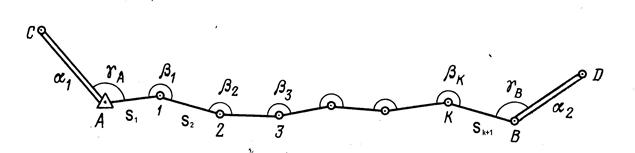 Рис. 4.2. Полигонометрический ход. Условные обозначения: А,В -исходные пункты хода полигонометрии; АС, ВD - твердые или исходные направления; α 1, α 2 - исходные дирекционные углы; γА, γВ - примычные углы; Применение метода полигонометрии выгодно в закрытой местности (например, в залесенной местности или на застроенных территориях), так как требует строительства значительно меньшего числа дорогостоящих геодезических знаков по сравнению с триангуляцией для открытия видимости между пунктами. Однако при создании государственных плановых геодезических сетей высшего класса он менее выгоден, чем триангуляция, потому что имеет значительно меньшее число избыточных измерений, слабые полевые контроли, а, следовательно, меньшую точность. Метод полигонометрии получил очень широкое распространение при создании сетей сгущения, включая и инженерно-геодезические сети.